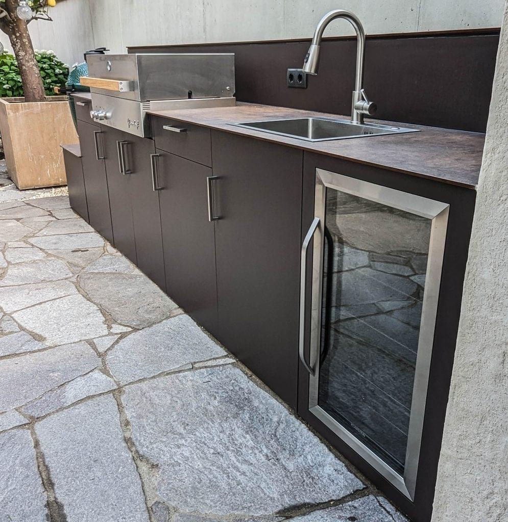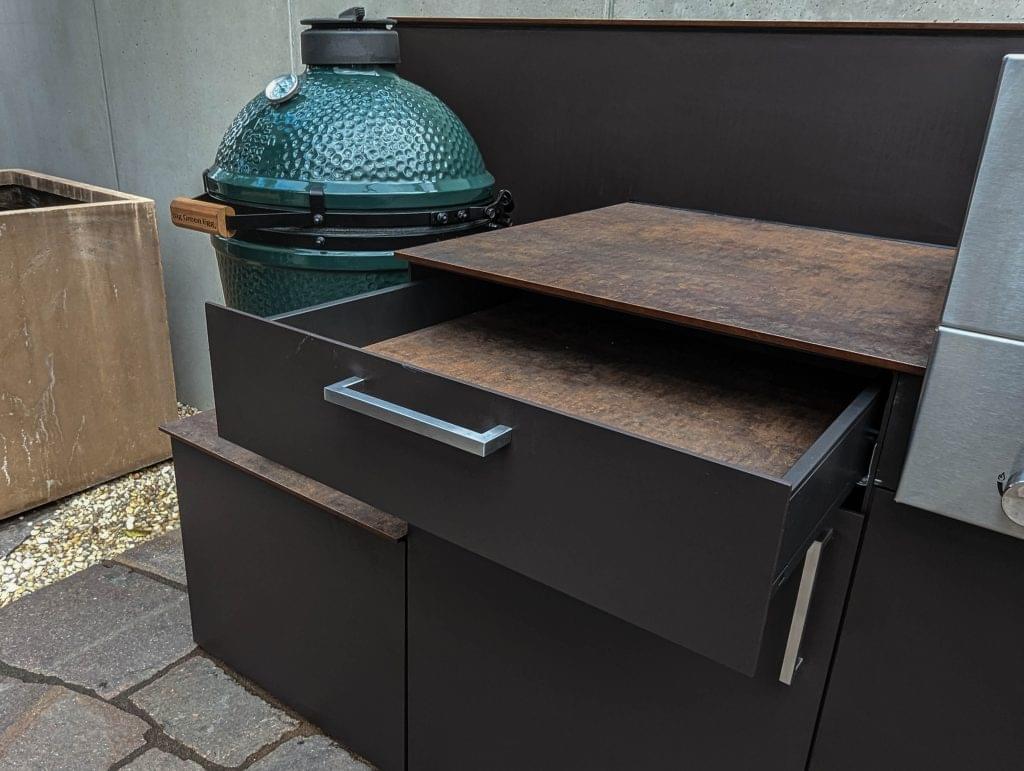 Ausgestattet ist die Küche mit einem Flammkraft Block C sowie einem Big Green Egg Medium – eine Kombination, die vielseitige Grill- und Kochmöglichkeiten eröffnet.